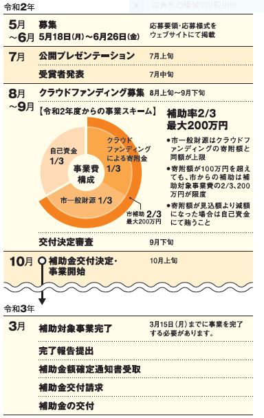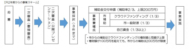 今年度は、新たにふるさと納税型クラウドファンディングを活用することで、広く事業を周知するとともに、寄附を通じて様々な方からの事業への賛同・参画を誘引し、交流人口、関係人口の創出を図ります。併せて、補助事業についても、補助上限額を150万円から200万円に、採択件数を2件から3件にそれぞれ拡充します。