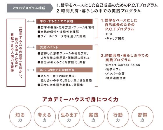 物事の変化が加速していく、これからの時代。ここ山口で、予測できない事柄や社会情勢に立ち向かえる次世代のリーダーを育むため、本施設の独自プログラムである、哲学をベースとした時間共有型のキャリア開発「P.C.Tプログラム(Philosophy-based Career Development Through Time Sharing)」を提供します。