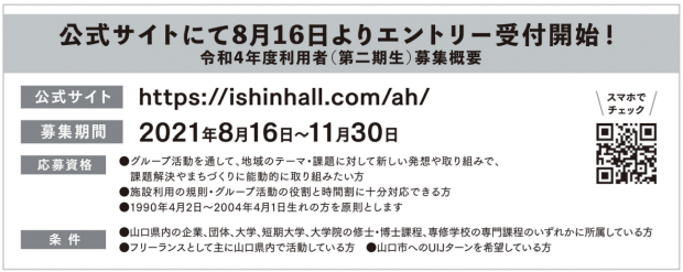 アカデミーハウスは、異業種の若手人材(学生・社会人)をターゲットにした居住型の人材育成施設で、山口地域を牽引する次世代のリーダーとなりうる自律した人材(オトナ)の育成とともに、地元の企業や起業家、大学、地域、行政等との人的な交流・コミュニティ作りを通じ、若手人材の地域定着を図っていくことを目的としており、本施設に入居し、共同生活の中で、様々なグループ活動に一緒に取り組んでいただける方を募集します。