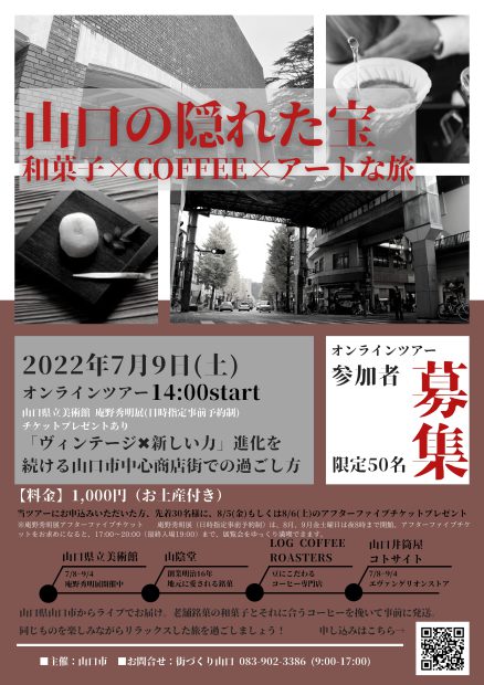 山口市の銘菓やコーヒーを自宅で味わいながら、山口市中心商店街を巡るオンラインツアー「山口の隠れた宝 和菓子×COFFEE×アートな旅」を開催します。
