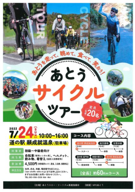 「道の駅願成就温泉」から道の駅長門峡「くんくのだいち」までの往復約60kmを、十種ヶ峰をはじめとした緑豊かな山々などの自然の素晴らしさや地元の食を楽しみながらサイクリングします。